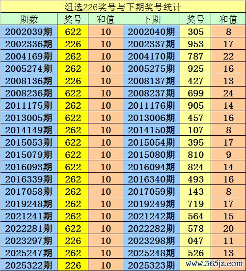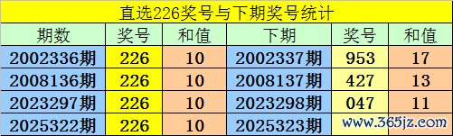 第2025322期3D奖号为:226,历史上该号码直选开出4次,下期号码划分为:953、427、047。
